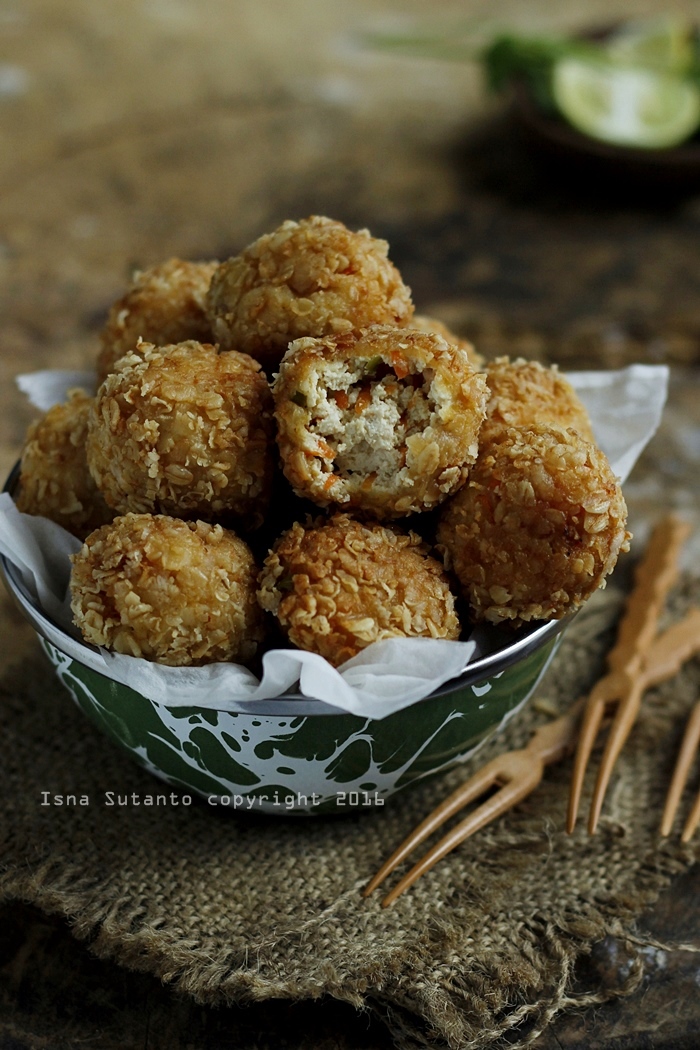 Cuci bersih tahu, tiriskan. Peras tahu agar tidak terlalu berair, haluskan dengan garpuh. Campur tahu dengan bumbu, udang, wortel parut, dan daun bawang. Aduk rata. Ambil satu sendok makan adonan tahu, bentuk bulat. Lapisi seluruh permukaannya dengan tepung terigu, celupkan dalam kocokan telur lalu lapisi dengan oatmeal hingga rata. Susun dalam wadah tertutup, simpan dalam frezzer 30 menit. Goreng dalam minyak panas dengan api sedang hingga kecoklatan. Angkat, tiriskan. sajikan dengan rawit atau saus sambal.