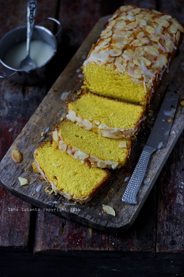 Panaskan oven 175’C. Siapkan loyang loaf olesi margarin dan taburi sedikit terigu, atau bisa juga dilapisi kertas roti. Ayak tepung terigu, baking powder, soda kue dan garam, sisihkan. Dalam wadah lain, campur yogurt, perasan lemon dan vanili exstrak aduk sampai tercampur. Kocok margarine dan gula pasir dengan kecepatan sedang sampai lembut dan gula pasir menjadi halus. Tambahkan telur satu per satu sambil terus dikocok, masukan kulit lemon kocok rata. Tambahkan campuran tepung dan yogurt bergantian ke dalam adonan sambil terus dikocok sampai semua tercampur rata, penambahan diawali dan diakhiri dengan tepung. Beri pewarna bila suka, aduk sampai tercampur rata. Tuang adonan dalam loyang deri taburan almond slice, ratakaan. Panggang selama 40 menit atau sampai adonan kering bagian dalamnya jika ditusuk. Angkat, dinginkan cake dirak kawat.